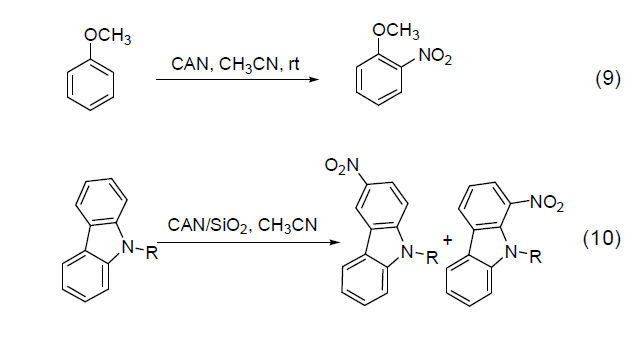 ★除硬汉视频黄色反應外,CAN是一種有效的硝化劑,適用於芳環體係的硝化。例如,CAN與苯甲醚在乙腈中反應得到鄰硝化產物(式9)[10]。然而,由於CAN的強硬汉视频黄色性,芳環體係往往發生多硝化反應,甚至生成難以分離的聚合物。研究發現,CAN在矽膠上的吸附可以減少CAN的硬汉视频黄色,從而減少多硝基產物的生成。例如,通過使用乙腈中的CAN和矽膠作為載體,硬汉视频在线官网下载免费版鈰銨中的9-烷基哢唑的產率可以提高到70%-80%(式10)[11]。
