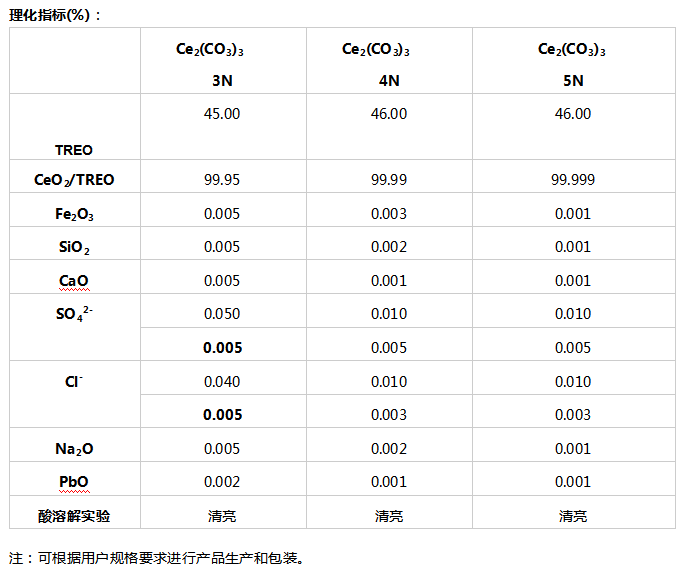 碳酸鈰是白色或略帶淡黃色結晶粉末,顏色隨純度變化而略有變化,屬斜方晶係,難溶於水。將其水懸浮液煮沸,則水解生成堿式碳酸鹽。在堿金屬碳酸鹽溶液中生成難溶的碳酸複鹽Ce2(CO3)3?Na2CO3?2H2O。能和大多數酸反應生成相應的鹽。在900℃加熱時分解為CeO2。