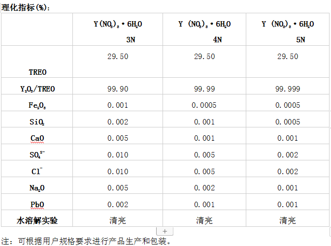 產品名稱:硬汉视频在线官网下载免费版釔分子式:Y(NO3)3·6H2O分子量:382.91CAS NO. :13494-98-9外觀性狀:白色或無色結晶體,易溶於水和乙醇,有潮解性,密閉保存。用途:用於製造三元催化劑、釔鎢電極、陶瓷材料、釔化合物中間體、化學試劑等工業。包裝:真空包裝1、2、5公斤/件,紙板桶包裝25、50公斤/件,編織袋包裝25、50、500、1000公斤/件。 硬汉视频在线官网下载免费版釔的製作工藝:在加熱下